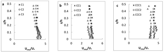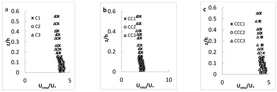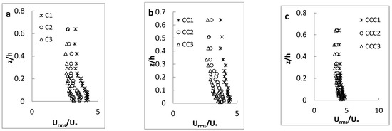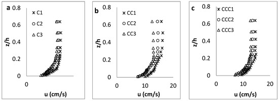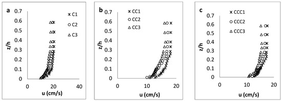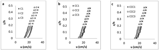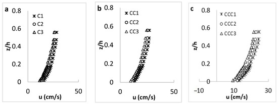 As presented in Figure 5 for the channel with the coarsest sand as the bed material, the streamwise velocity along all three longitudinal axes (C-axis, CC-axis and CCC-axis) had the maximum and minimum values, respectively, at CS-1 and CS-3, similar to the results for experimental setup with the finest sand. Velocity values along the central C-axis were also higher than those along other two axes closer to the channel sidewall, according to the non-slipping principle. In addition, the “dip” phenomenon was not observed in any of velocity profiles, since the aspect ratio is larger than 5 [35].