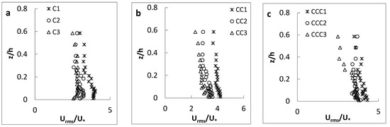 The distribution of streamwise velocity component (u) for the finest sand (d50 = 0.56 mm) is shown in Figure 4. One can see from Figure 4 and Figure 5 that the streamwise velocity had the largest and lowest values, respectively, at cross Section 1 (CS-1) (with the minimum channel width) and CS-3 (with the maximum channel width) along all three longitudinal axes (C-axis, CC-axis and CCC-axis). The velocity values along the C-axis were also higher than those along other two axes, according to the non-slipping principle. Furthermore, since the aspect ratio (w/h) is less than 5, the location of the maximum velocity occurred below the water surface. This phenomenon, which is defined as “dip”, occurs in three dimensional flows and narrow channels due to the presence of secondary currents [35]. It was reported in previous works [21,36] that the vegetated sidewalls of a channel play a major role in generating secondary currents. In this study, the vegetated sidewalls and the varying width of the channel lead to the development of secondary currents; hence, the “dip” phenomenon appears in most velocity profiles. As showed in Figure 5, for the smaller aspect ratios, the velocity profiles along all axes were clearly affected. In contrast, for larger aspect ratios, the effects of channel banks and secondary currents limit the zone near the channel walls; and thus, the dip phenomenon would not be observed along the central C-axis. At CS-1, where the channel width and the aspect ratio are the least, the “dip” phenomenon occurred along the central C-axis (Figure 4a); but with the increase in the channel width, the “dip” phenomenon was not observed along the central C-axis (Figure 4b,c).