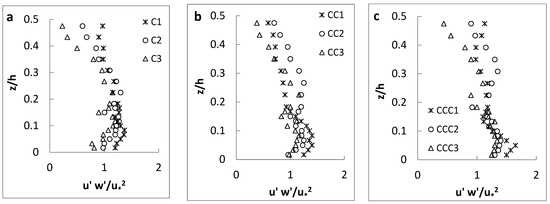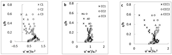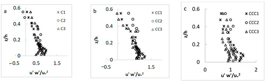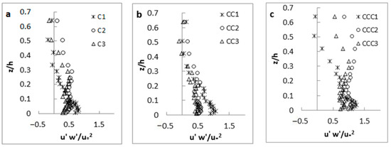 (a–c) Reynolds shear stress distributions (experimental setup: S = 0, d50 = 0.56 mm).
