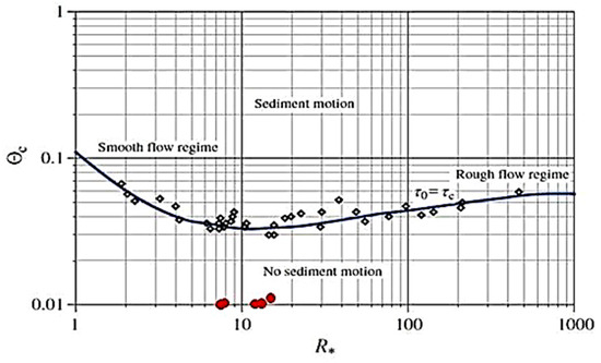 The criterion proposed by Shield [14] is the most important and widely used approach for assessing the incipient motion of bed material. In the Shields diagram the movements of sediment particles can be assessed by using the critical shear Reynolds number and Shields dimensionless parameter. When a data point lies on the Shields curve, it indicates the “incipient motion” condition. Points located below and above the curve represent “no sediment motion” and “sediment motion” condition, respectively. However, it was proved later that the critical Shields stress for the incipient motion of particles deviates from the Shields curve, due to some uncertainties in calculating the bed shear stress, in case of the presence of non-uniform flow, as well as the differences in definition of the threshold condition [5,15,16].