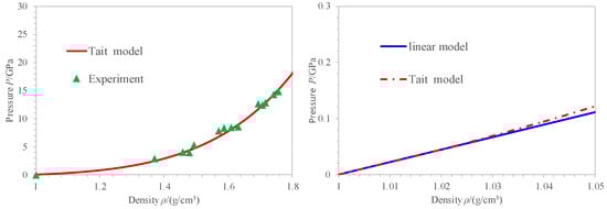 Usually, three types of empirical models are frequently used. The first type is the linear model, such as the stiff state equation [12,13,14]. The second type is the exponential model, such as the Tait model [19,20]. The third type is a polynomial form Mie–Grüneisen model that considers the temperature variation, such as the Steinberg equation of state [15]. These three types of models each have their own focus and scope of application. The linear stiffness model is mainly suitable for the problem with medium–low pressure and should be used within the range of p < 1 GPa. Within this range, the relationship between the pressure and density can be approximately described by a linear model. The exponential Tait model can be used over a wider water pressure range (p < 20 GPa), which is in good agreement with experiments. The Steinberg model can be used within a wider water pressure range (p < 40 GPa), especially suitable for ultra-high pressure and high-temperature problems such as underwater near-field explosions.
