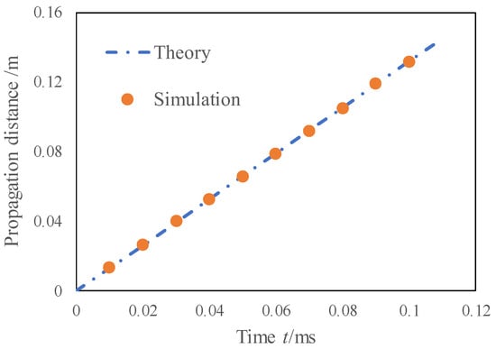 During the simulation process, a horizontal pipe was approximately used. Considering the influence of redundant dimensions at both ends of the measurement points, the pipe length was set as 36 m. The existing experimental data show that the attenuation of the peak pressure is not significant during the single propagation process of the pulse wave. Therefore, the fluid viscosity is ignored here, and the inviscid equation is used for calculation and simulation. The water flow velocity is 0.1 m/s, and the right end valve of the pipeline is closed at t = 0.009 s, which is the same as the experimental condition. During the simulation process, the water pressure variation at the midpoint and right endpoint of the pipe is recorded. The number of grids used in the calculation is Nx = 1000, and the time step satisfies the CFL condition. The wave speed is 1319 m/s when the water temperature is 15.4 °C [23]. The detailed simulation parameters are listed in Table 1.