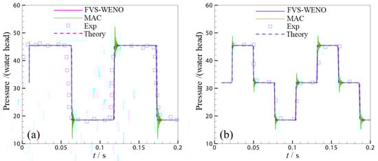 This article uses the MAC format [18] and FVS-WENO format for calculations, and the simulation results are shown in Figure 2 and Figure 3. The monitored wave speed agrees well with the theoretical wave. Figure 3 shows that the water pressure data provided based on the above two formats are consistent with the experimental data. However, by comparison, it is seen that the pressure given by the MAC format has a dispersion effect, and there is oscillation upstream of the discontinuous wave. The dispersion effect of the FVS-WENO format is not significant, and the pressure data provided are in better agreement with theoretical and experimental data. When evaluating the peak pressure of the water hammer, the FVS-WENO format is superior to the MAC format. The present results also indicate that the derived FVS formula is reliable.