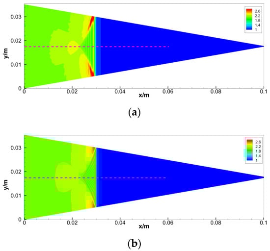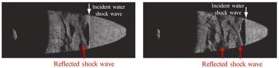 We also compared the topological shape of the reflected shock wave with the existing experimental data [27,28], as shown in Figure 6 and Figure 7. We found that the present simulation results based on the FVS-WENO method are consistent with the experimental observations. The captured shock wave agrees well with the experimental picture. Namely, the present numerical method can be used to simulate the evolution of water shock waves. These comparisons further confirm that the proposed FVS formula and developed program is suitable for the simulation of weakly compressible water flow.