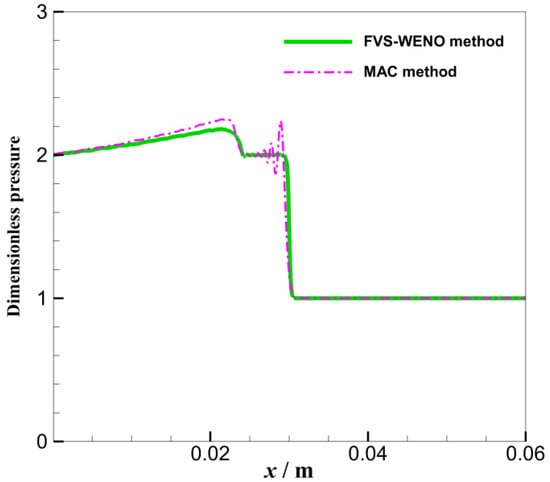 In order to demonstrate the superiority of the FVS-WENO format in pulse peak prediction, we conduct a series of simulations and comparisons. The simulation parameters are as follows: the length of the wedge-shaped structure is L = 0.1 m, the width of the left end is H = 0.03527 m, and the wedge angle is 20°. At the initial point, the water pressure inside the wedge-shaped structure is 1 MPa. Within the time interval of 0 < t < 1 ms, a constant water pressure p = 2 MPa is applied to the left boundary. The numerical calculation domain is a rectangular area (0 ≤ x ≤ 0.1 m, 0 ≤ y ≤ 0.03527 m) with grid number Nx = 1600, Ny = 564, and the time step meets the CFL condition. The wave speed is 1491 m/s. The immersed boundary (IB) method [25,26] is adopted to deal with the structure boundary. The detailed simulation parameters are listed in Table 2.