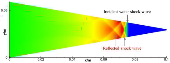Simulation results of water shock wave reflection in wedge-shaped structure based on the present FVS-WENO method. The red represents the high-pressure and the blue represents the low-pressure.