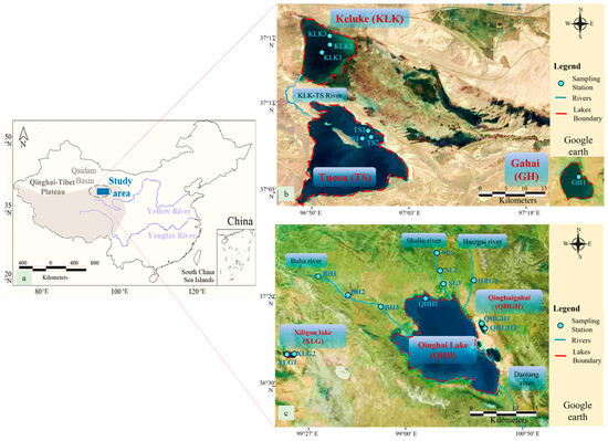 Location of the study area. (a) Schematic map of the Northeast Tibetan Plateau in China. (b) The detailed sampling stations of Keluke Lake, Tuosu Lake, and Gahai. (c) The detailed sampling stations of Qinghai Lake, Qinghaigahai, Xiligou Lake, Shaliu River, Haergai River, and Buha River.