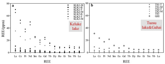 Region I: Concentrations of REEs in particulate matter from three lakes. (a) Keluke Lake. (b) Tuosu Lake and Gahai.