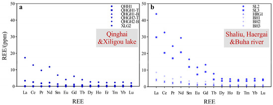 Region II: Concentrations of REEs in particulate matter from lakes and rivers. (a) Qinghai Lake and its subsidiary lakes (Qinghaigahai and Xiligou Lake). (b) the Shaliu, Haergai, and Buha rivers.