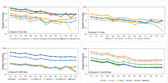 Standardized distribution pattern of REEs globular meteorites in lakes and rivers in two regions. (a) Region I: Keluke Lake. (b) Region I: Tuosu Lake. (c) Region II: Qinghai Lake and its subsidiary lakes (Qinghaigahai and Xiligou Lake). (d) Region II: Shaliu and Buha rivers.