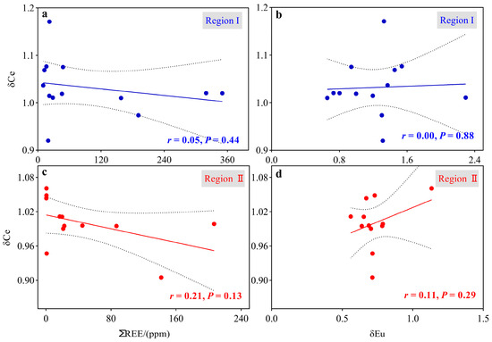 Correlation between δCe and ∑REE, δCe and δEu of particulate matter in Region I (a,b) and Region II (c,d).