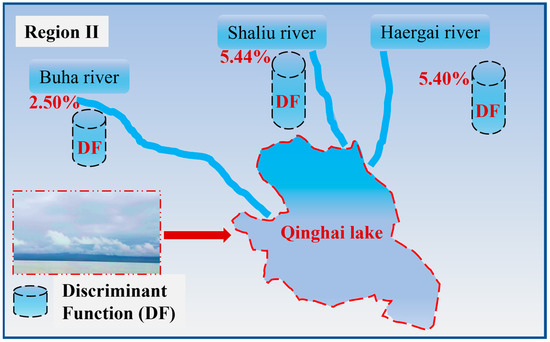 According to the standard partitioning model and characteristic parameter analysis, the particulate matter of Qinghai Lake in Region II mainly originates from terrestrial source inputs, of which the terrestrial source debris is mainly transported to the lake through rivers. In order to more accurately determine the degree of contribution of each recharging river to the particulate matter of Qinghai Lake, the study utilized the discriminant function (DF) to reveal the degree of similarity between the particulate matter of Qinghai Lake and that of the land-source material [54].