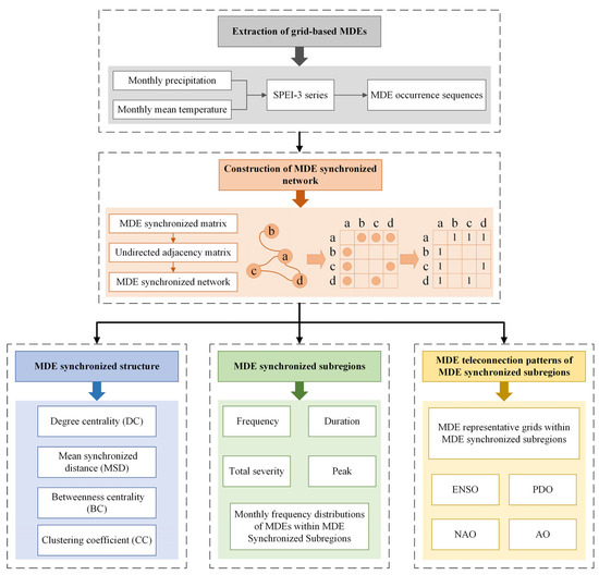 The research flowchart shown in Figure 2 encompasses the following sequential steps: First, the grid-based MDEs are extracted based on the SPEI-3 series to obtain corresponding sequences of MDE occurrences. Subsequently, the MDE synchronized network over the YRB is constructed based on the MDE synchronized matrix, as depicted by the schematic diagram of network construction. Based on the constructed network, the MDE synchronized structure, MDE synchronized subregions, and MDE teleconnection patterns of individual subregions are finally identified.
