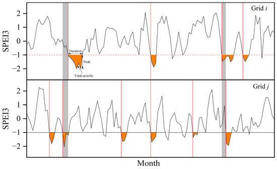 Hypothetical demonstration for extracting meteorological drought events (MDEs) based on the series of 3-month standardized precipitation evapotranspiration index (SPEI-3) of grids i and j. The upper and lower subplots represent the SPEI-3 series of grids i and j, respectively. The orange-shaded regions denote the extracted MDEs with a duration of no less than 3 months. The numbers of MDEs at grid i and grid j are 4 and 6, respectively. The red lines indicate the occurrence time of the MDEs. The gray-shaded regions show three groups of synchronously occurring MDEs at grids i and j, where the first group presents the MDE at grid i occurring later than that at grid j, the second group shows the MDEs at both grids occurring simultaneously, and the last group exhibits the MDE at grid i occurring earlier than that at grid j. The identified duration, total severity, and peak of the first MDE of grid i are also represented in the upper subplot.