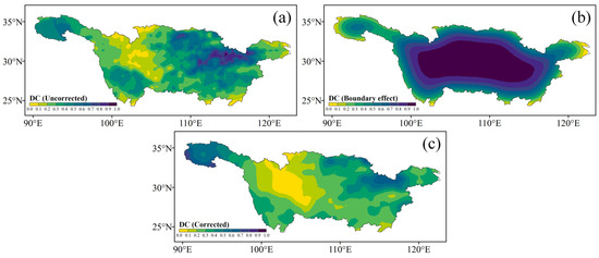 Spatial distributions of (a) uncorrected degree centrality (DC) values obtained from the original MDE synchronized network over the YRB, (b) boundary-affected DC values obtained from 100 surrogate networks, and (c) corrected DC values calculated by dividing the uncorrected DC values by the boundary-affected DC values.