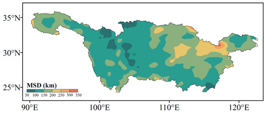 Spatial distribution of mean synchronized distance (MSD) obtained from the MDE synchronized network over the YRB.
