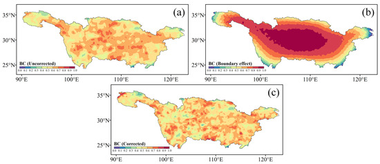 The spatial distributions of the BC results are presented in Figure 6. Similar to the boundary-affected DC results, the boundary-effected BC results in Figure 6b show an increase from the peripheral zones to the internal zones, resulting in relatively higher corrected BC values compared to the uncorrected ones in the peripheral zones, as well as lower corrected BC values than the uncorrected ones in the internal zones, as illustrated in Figure 6c. Figure 6c demonstrates that there are two main pathways for the propagation of synchronous MDEs in the basin, which are characterized by high BC values. The first pathway is a central path traversing the southwestern and central parts of the YRB along a northeast–southwest direction. The second pathway is an eastern path crossing the southern and northeastern parts of the YRB along a northeast–southwest direction. These two pathways signify the prevailing tendency of the climatic factors responsible for driving MDEs.