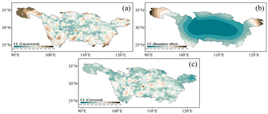 Spatial distributions of (a) uncorrected clustering coefficient (CC) obtained from the original MDE synchronized network over the YRB, (b) boundary-affected CC obtained from 100 surrogate networks, and (c) corrected CC calculated by dividing the uncorrected CC values by the boundary-affected CC values.