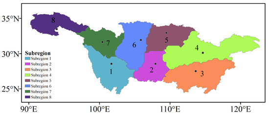 The spatial distribution of MDE synchronized subregions in the YRB is shown in Figure 8. A total of eight subregions were identified in the YRB. Subregions 1, 2, and 3 are located in the southern part of the basin, while the remaining subregions are located in the northern part of the basin. The overall distribution of individual subregions was close to that identified by Huang et al. [43], but two additional subregions were identified in this study, i.e., Subregions 6 and 7. This difference verifies the superior sensitivity of the Leiden algorithm in regional partitioning. The points marked in Figure 4 represent the positions of identified MDE representative grids in individual subregions. The spatial ranges of individual subregions are generally consistent with the MDE spatial scales identified by the DC and MSD results, which means that most grids within these subregions possess similar DC and MSD values and are more likely to experience synchronous MDEs. For instance, the grids with the highest DC and MSD values are mainly distributed in Subregion 4, which possesses the greatest area, while grids with the lowest DC and MSD values are predominantly found in Subregion 7, which covers the smallest area.