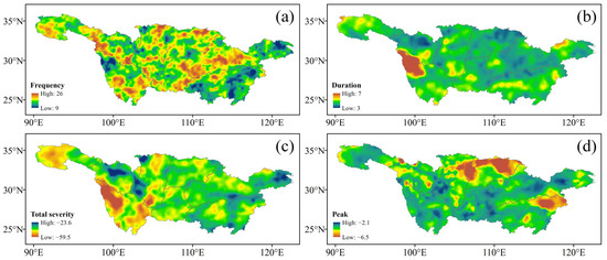 Spatial distributions of (a) frequency, (b) duration, (c) total severity, and (d) peak for grid-based MDEs over the YRB during 1961–2021.