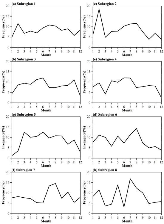 The occurrence months of MDEs were counted for all grids within the individual subregions, and the subregion-averaged frequency distributions at the temporal scale are shown in Figure 10. The variations in the monthly MDE occurrence distributions across different subregions are apparent, which is the outcome of diverse climatic patterns driving MDEs in each subregion. This indicates that different climatic factors may influence water vapor transport and the convergence of cold and warm air masses in each subregion during distinct periods, leading to variations in the frequencies of MDEs. In Subregions 1–7, the season with the highest frequency of MDEs gradually shifts from winter (December, January, and February) to summer (June, July, and August), while Subregion 8 exhibits greater month-to-month frequency fluctuations. In Subregions 1 and 2, February stands out as the month with the highest MDE frequency, followed by increased frequency in the summer months. Subregion 2, in particular, displays more pronounced variations. Although Subregions 3 and 4 are both situated in the middle and lower reaches of the YRB, they feature distinct temporal frequency distributions of MDEs. In Subregion 3, May and June experience the highest MDE frequencies, while Subregion 4 sees increased MDE frequency in June and July, with a notable divergence in March between the two subregions. Subregion 5 demonstrates a relatively high and stable MDE frequency, fluctuating only slightly from March to September. Subregion 6 exhibits substantial month-to-month variations in MDE frequency, with distribution patterns akin to those of Subregion 8. Finally, the MDEs in Subregion 7 are primarily concentrated in July and August, with lower frequencies observed in other months.