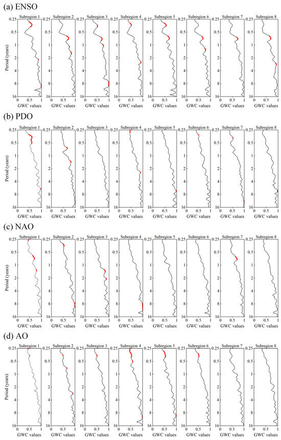 Global wavelet coherence (GWC) results between four teleconnection factors (ENSO, PDO, NAO, and AO) and the SPEI-3 series of MDE representative grids within all of the MDE synchronized subregions. GWC values are shown as black lines, and significant influences (at the 95% significance level) are marked in red.