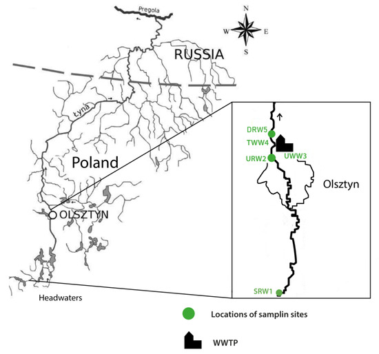 The study was conducted on the Łyna River (length—190 km, catchment area—5700 km2, average depth—2 m) which is one of the longest rivers in north-eastern Poland that serves as a recreational outlet and a central part of many local economies (Figure 1). The study covered the southern part of the catchment area at the river source and urban areas. The southern and central parts of the catchment are extensively forested (68%), and the remaining parts are occupied by farmland and urban areas. The river source is characterized by headward erosion, and the Łyna River Source Reserve (153 m above sea level) has been created to protect this unique ecosystem. The reserve is subjected to minimal anthropogenic pressure. Along its course, the river intersects the Warmian Forest Reserve which is a part of the Natura 2000 network of protected habitats and bird species. The river that flows through Olsztyn, the largest city along its course (area—88.3 km2, population—180,000) and the capital city of the Region of Warmia and Mazury (for a detailed description of the Łyna River, refer to Gotkowska-Płachta et al. [6]). A mechanical–biological WWTP with an average daily processing capacity of 32,000 m3 is located on the Łyna River downstream from Olsztyn. Treated municipal wastewater from Olsztyn and the surrounding areas is evacuated directly to the river (the wastewater treatment process and the plant’s operating parameters have been described in detail by Gotkowska-Płachta [5]).