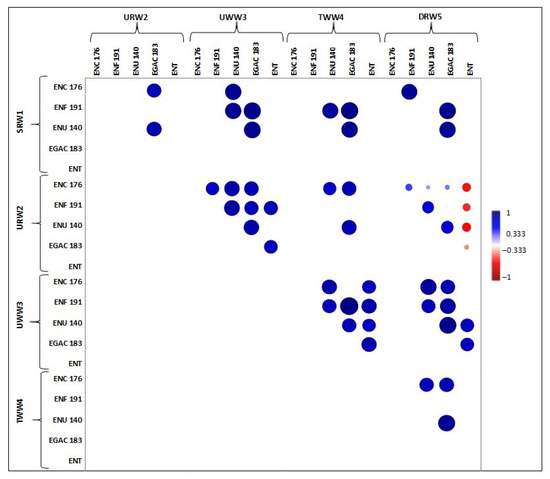 The calculated values of Spearman’s rank correlation coefficients revealed highly significant positive correlations (p ≤ 0.05) between the ENT counts determined with the use of ENF191, ENU140, and EGAC183 probes in URW2 and UWW3 samples. Enterococcal counts enumerated with ENC176 and ENU140 probes in SRW1 samples were positively correlated with the ENT counts enumerated with EGAC183 and ENU140 probes in river water and wastewater from the remaining sampling sites. Enterococcal counts determined via the culture-based method were significantly correlated (p ≤ 0.05) with most enterococci enumerated in TWW4 and DRW5 samples (Figure 2).
