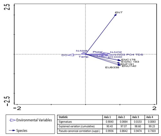 The effects of environmental and biogenic factors on ENT counts in the analyzed water and wastewater samples were evaluated via principal component analysis (PCA) in the CANOCO 5.0 program [60].