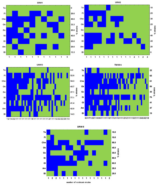 The highest percentage of enterococci isolated from UWW3 and TWW4 samples (54–77% and 65–76%, respectively) were resistant to chemotherapeutics (Che), streptogramins (St), and fluoroquinolones (Fl). The strains isolated from UWW3 and TWW4 samples had a similar resistance profile, but TWW4 strains were resistant to a higher number of antimicrobials. The percentage of strains resistant to different classes of antibiotics was much smaller in river water sampled upstream from the WWTP. The highest proportion of strains isolated from SRW1 and URW2 samples (approx. 40%) were resistant to glycopeptides (Gl), oxazolidinones (Ok), and chemotherapeutics (Che). Similarly to TWW4 samples, in DRW5 samples collected downstream from the WWTP, the highest percentage of isolates were resistant to glycopeptides (Gl, 60%), streptogramins (St, 50%), and chemotherapeutics (Che, 58%). In all sampling sites, the smallest percentage (0–22%) of strains were resistant to tetracyclines (Te) (Table 4, Figure 4).