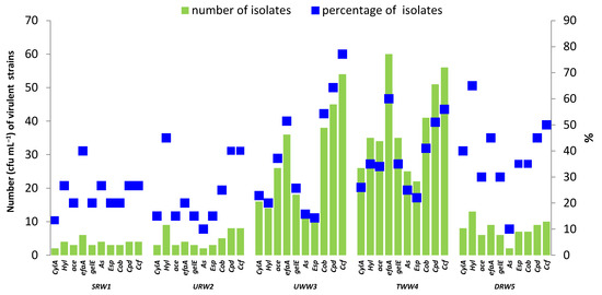 Number (CFU mL−1) and percentage of virulence genes in enterococcal strains isolated from SRW1, URW2, UWW3, TWW4, and DRW5 samples.
