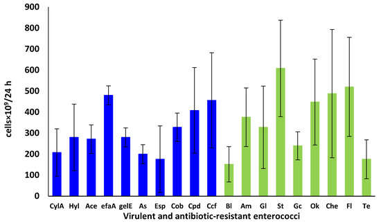 - Shankar, V.; Baghdayan, A.S.; Huycke, M.M.; Lindahl, G.; Gilmore, M.S. Infection-derived Enterococcus faecalis strains are enriched in esp, a gene encoding a novel surface protein. Infect. Immun. 1999, 67, 193–200. [Google Scholar] [CrossRef] [PubMed]