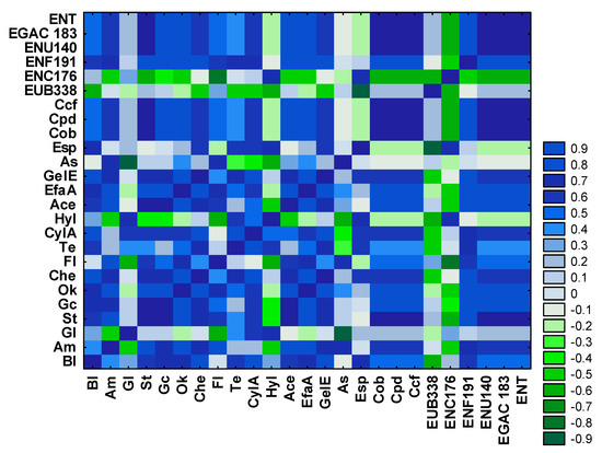 The correlation analysis revealed significant (p ≤ 0.05) correlations between the counts of most ENT determined via FISH and culture-based methods. Significant (p ≤ 0.05) correlations were also noted between the groups of these bacteria and the majority of antibiotic-resistant strains and strains harboring virulence genes. Strains resistant to different classes of antibiotics were also significantly correlated with strains harboring virulence genes (Figure 7).
