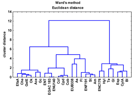 The dendrogram illustrating the relationships between the presence of virulence genes, the antibiotic resistance of the analyzed strains, and their quantitative and qualitative composition determined via the FISH method, revealed three main clusters. The first cluster contained strains that were resistant to Che, Ok, and Gc, and strains that carried efaA, gelE, and ace genes. The second cluster was composed of bacteria identified via FISH and culture-based methods (ENT176, ENU140, EGAC183, EUB338, ENT), strains carrying virulence genes (ccf, cpd, cob, as), and antibiotic-resistant strains (Fl, St, and Am). The third cluster grouped bacteria determined with the use of probe ENC176, strains harboring hyl, esp, and cylA genes, and antibiotic-resistant strains (Te, Gl, and Bl) (Figure 8). The hierarchical clustering analysis revealed the presence of correlations between the biodiversity, multidrug resistance, and virulence of enterococci isolated from UWW3 samples and those isolated from TWW4 and DRW5 samples. SRW1 and URW2 samples constituted a separate group in this respect (Figure 9).