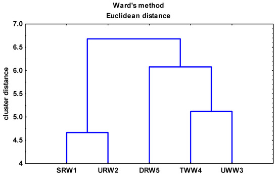 The dendrograms revealed the presence of correlations between the biodiversity of bacteria identified in the FISH assay and the multidrug resistance and virulence of the isolated enterococci (Figure 8). The agglomerative clustering analysis confirmed that UWW3, TWW4, and DRW5 samples were mostly closely related in terms of the biodiversity, multidrug resistance, and virulence of the isolated enterococci. SRW1 and URW2 samples constituted a separate group in this respect (Figure 9). The results of this study indicate that anthropogenic pressure exerts a significant influence on river microbiota and microbial pollution in lotic environments.