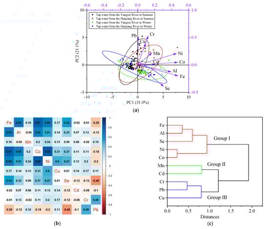 Results of (a) principal component analysis, (b) Spearman correlation analysis, and (c) hierarchical cluster analysis among heavy metals in tap water in Wuhan.