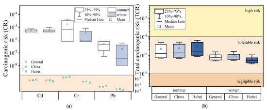 (a) Carcinogenic risk of Cd, Cr and Pb and (b) total carcinogenic risk in tap water from residential areas in Wuhan. Note: only the box diagram based on the general values of the exposure parameters is shown for better visualization of CR in (a), and the average values of CR based on different exposure parameters are shown for each metal element.