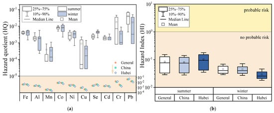 (a) Hazard quotient and (b) hazard index of heavy metals in tap water from residential areas in Wuhan. Note: only the box diagram based on the general values of the exposure parameters is shown for a better visualization of HQ in (a), and the average values of HQ based on different exposure parameters are shown for each metal element.