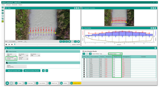 Discharge from surface image velocimetry in Hydro-STIV, with an initial alpha value of αi = 1, to obtain (Hurunui River, New Zealand). Green boxes show αi = 1 ‘Calibration Factor’ and the ‘Total Discharge’ obtained with this alpha .