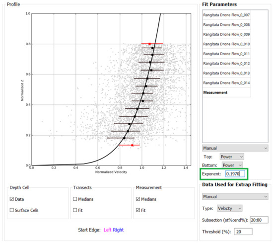 Power law exponents can be easily found in QRev (e.g., Biggs et al. [42]), similar to the method used in Section 2.3. First, the ADCP measurement is loaded in QRev, then navigate to ‘Extrapolation’ then ‘Velocity’ and specify the subsection as 20% to 80% (Figure 3), focusing on data from the central part of the channel while avoiding the near-bank regions. The data will be presented with normalized elevation () on the y-axis and normalized velocity () on the x-axis. Next, opt for the ‘power’ extrapolation for both the ‘top’ and ‘bottom’ sections of the ADCP data. The power law is then automatically (or manually) fitted to the data. This provides the power law exponent M (Figure 3), which can be used to estimate alpha using the equation . In QRevInt (i.e., the international version of QRev) discharge-weighted average velocity profiles can be used [43], providing a better alternative than using ‘subsections’.