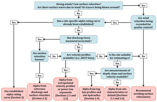 The accuracy of discharge measurements derived from surface velocities are highly dependent on the accuracy of conversions from surface velocity to depth-averaged velocity . This conversion factor is typically known as the ‘velocity coefficient’, ‘velocity index’, ‘calibration factor’, ‘alpha coefficient’, or simply ‘alpha’, where . At some field sites detailed in situ measurements can be made to calculate alpha, while in other situations (such as rapid response flood measurements) alpha must be estimated. This paper provides a review of existing methods for estimating alpha and presents a workflow for selecting the appropriate method, based on available data. Approaches to estimating alpha include: reference discharge and surface velocimetry measurements; extrapolated ADCP velocity profiles; log law profiles; power law profiles; site characteristics; and default assumed values. Additional methods for estimating alpha that require further development or validation are also described. This paper then summarises methods for accounting for spatial and temporal heterogeneity in alpha, such as ‘stage to alpha rating curves’, ‘site alpha vs. local alpha’, and ‘the divided channel method’. Remaining challenges for the accurate estimation of alpha are discussed, as well as future directions that will help to address these challenges. Although significant work remains to improve the estimation of alpha (notably to address surface wind effects and velocity dip), the methods covered in this paper could provide a substantial accuracy improvement over selecting the ‘default value’ of 0.857 for alpha for every discharge measurement.