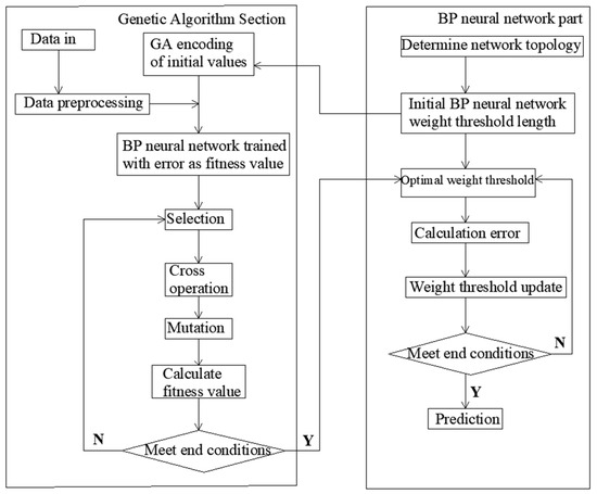 - Fitness Function. The fitness function calculates the absolute difference between the predicted values and the actual values, sums them up, and takes the reciprocal. The formula is as follows in Equation (8):In the equation, yi represents the actual value, ai represents the predicted value, and n represents the number of output nodes.