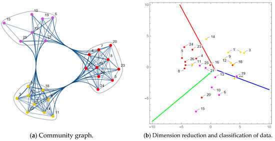 Then, we applied a method of pattern recognition to characterize the stakeholder groups from these two-dimensional data. The Mathematica function Classify learns from given classifications of clusters, offering various options. We applied it to the three clusters of stakeholders in two-dimensional space using logistic regression based on Agresti [], which is amongst the simplest methods of pattern recognition and defines neat geometric regions to localize the clusters (see Figure 2b).