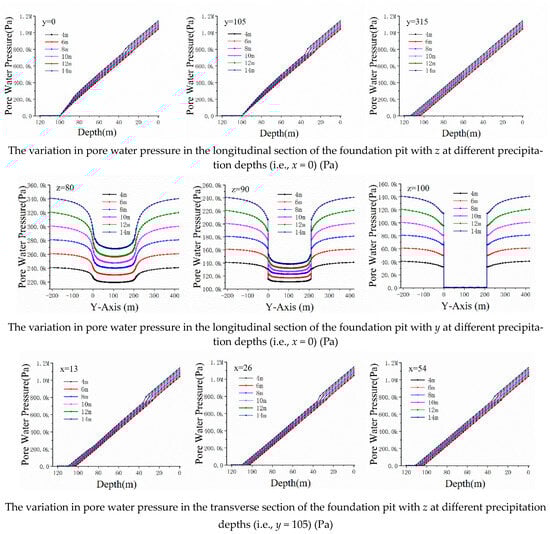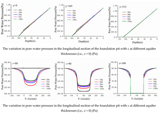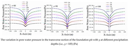 - Under the condition of the suspended water-stop curtain, the pore water pressure on the outer side of the water-stop curtain is greater than that on the inner side of the foundation pit. It increases linearly with an increase in the precipitation depth. As the aquifer thickness increases, it increases. The pore water pressure distribution characteristics deeply influence the dynamic water level curve.
