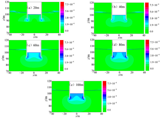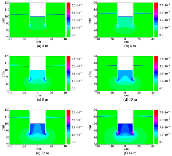 - Under the condition of the suspended water-stop curtain, the maximum seepage flow velocity occurs at the position where the curtain’s bottom leans towards the inner side of the foundation pit. The maximum seepage flow velocity increases linearly with an increase in the precipitation depth, and there is a threshold value for the aquifer thickness, which is five times the precipitation depth.