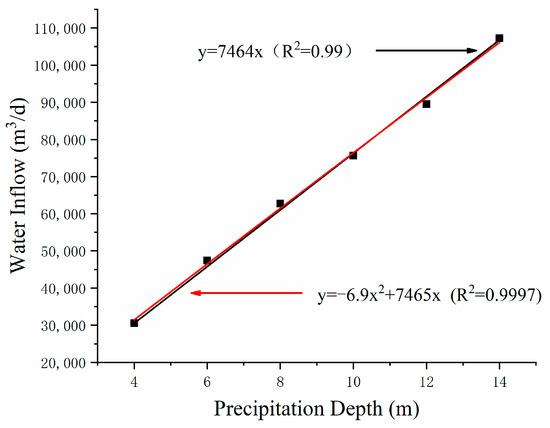 - Under the condition of the suspended water-stop curtain, the relationship between the precipitation depth and water inflow can be described by a linear or parabolic function; the relationship between the aquifer thickness and water inflow can be described by a logistic function.