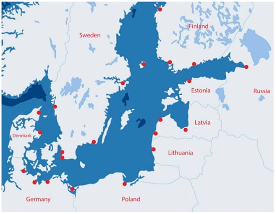 Map of ferry ports on the Baltic Sea. Source: Our Baltic website: www.ferryscan.com, (accessed on 10 July 2023).
