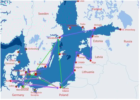 The Baltic Sea is one of the busiest passenger shipping areas in the world. The nine countries lying on the Baltic Sea have well-developed ferry connections with each other via numerous ports within the Baltic Sea []. Analyzing the map in Figure 1, we can see that Sweden and Finland have by far the largest number of ports and cities involved in passenger exchange, mainly due to the lengths of the coastlines that both countries have in comparison to the other Baltic countries. These countries also have the largest networks of international and domestic connections served by numerous operators. On the other hand, Denmark, due to its remote and problematic location in relation to the Baltic Proper, definitely has a difficult passenger exchange with the Baltic countries located in the eastern part (Finland, Russia, Estonia, Lithuania, and Latvia).