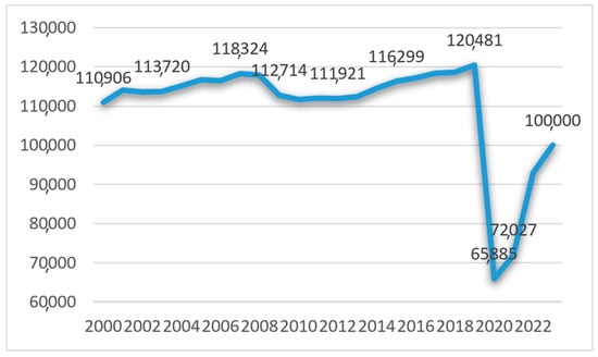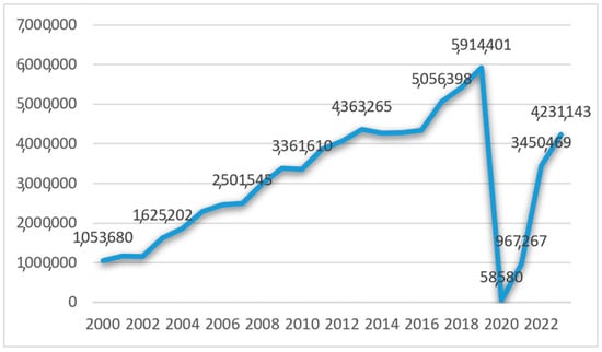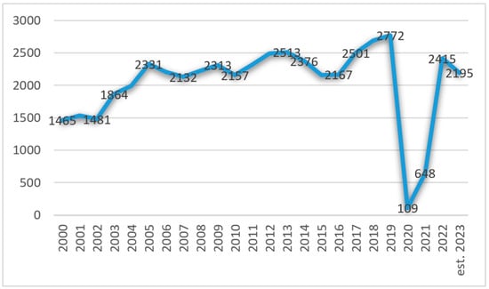 The number of ferry passengers in the Baltic Sea in the years 2000–2022, including the estimation for 2023 (in thousands of passengers). Source: Own study based on the statistical office of the European Union—Eurostat [].