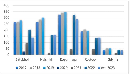 Calls of cruise ships in selected Baltic Ports in 2017–2022 with estimation for 2023. Source: Own study based on Cruise Baltic and Cruise Europe websites [,].